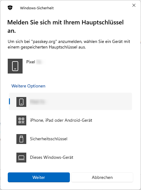 In dem vorstehenden Detailfenster nun das richtige Gerät wählen, „Weiter“ klicken und schon verbinden sich Windows und dein Gerät und du musst per weiterem Passcode, also Bildschirm-Pin, Gesicht oder Fingerabdruck den Prozess weiterlaufen lassen.